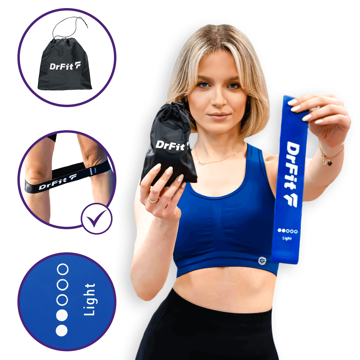 Zestaw 5 lateksowych gum oporowych DrFit o różnych poziomach pozwala na dostosowanie treningu do indywidualnych potrzeb każdej osoby.